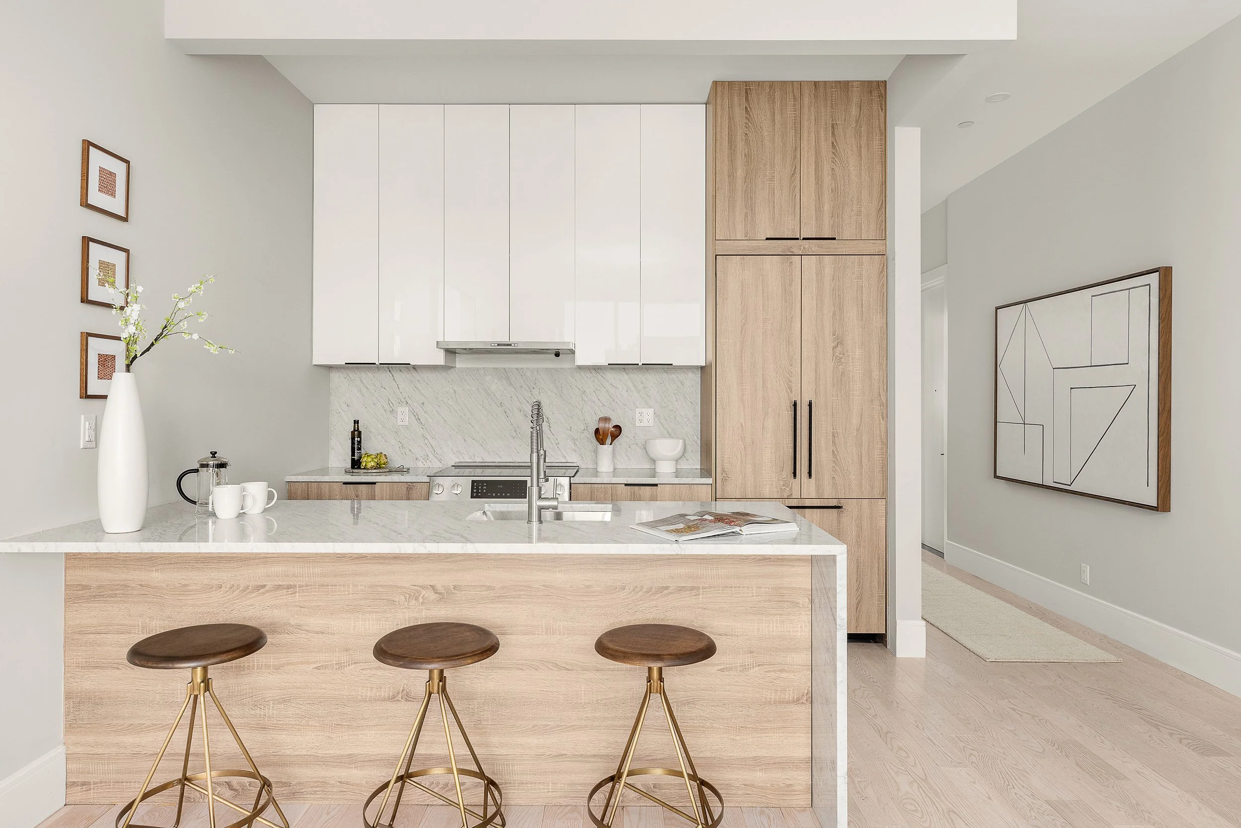 The five residences include one spacious 1-bedroom unit with a home office and private backyard, as well as four expansive full-floor 3-bedroom units. Each home is designed with floor-to-ceiling windows that flood the interiors with natural light, direct elevator access, in-unit washer dryers, and private outdoor spaces. The washed white oak flooring, spacious closets, and Porcelanosa bathroom finishes with heated floors add a luxurious touch to every unit.